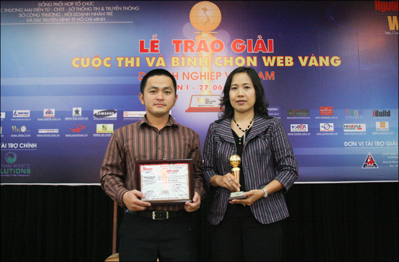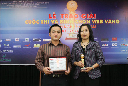 Ms Pham Thi Kim Tuyet Loan - General Manager of Vietnam Telephone Directory and Yellow Pages 2 Joint Stock Company and Mr Pham Ngoc Phuc, Director of Multimedia Yellow Pages Services Center at the ceremony